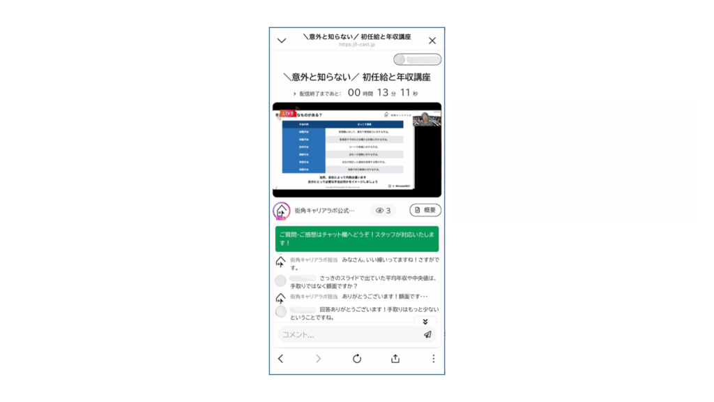 学生が就活に充てている隙間時間に有効的にアプローチし、学生との接点を増やせます。 - 事前録画により、生配信と比較して楽に放送可能